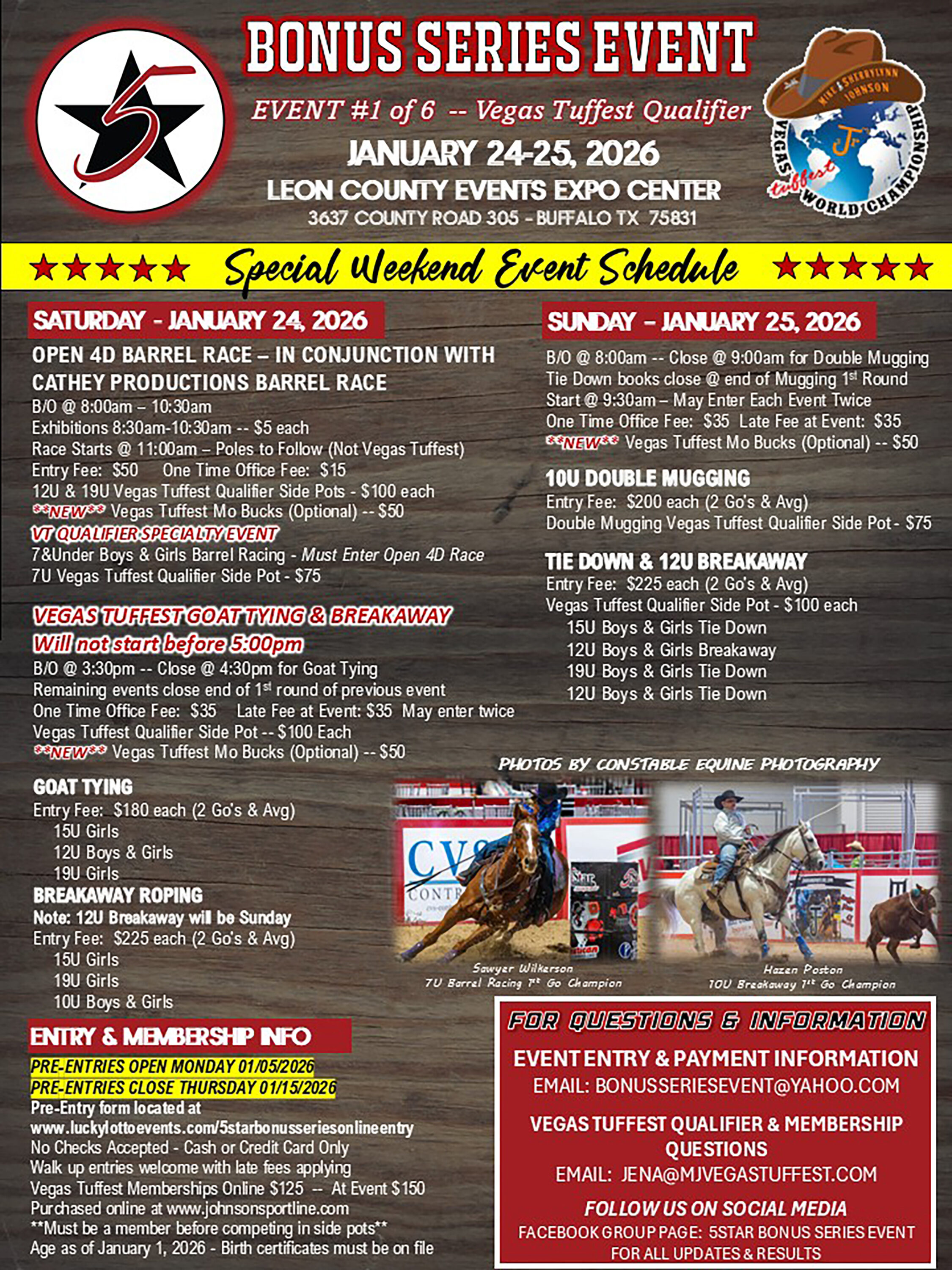 ONLINE PRE ENTRIES HAVE CLOSED FOR EVENT #1 OF 6 — BUFFALO TX